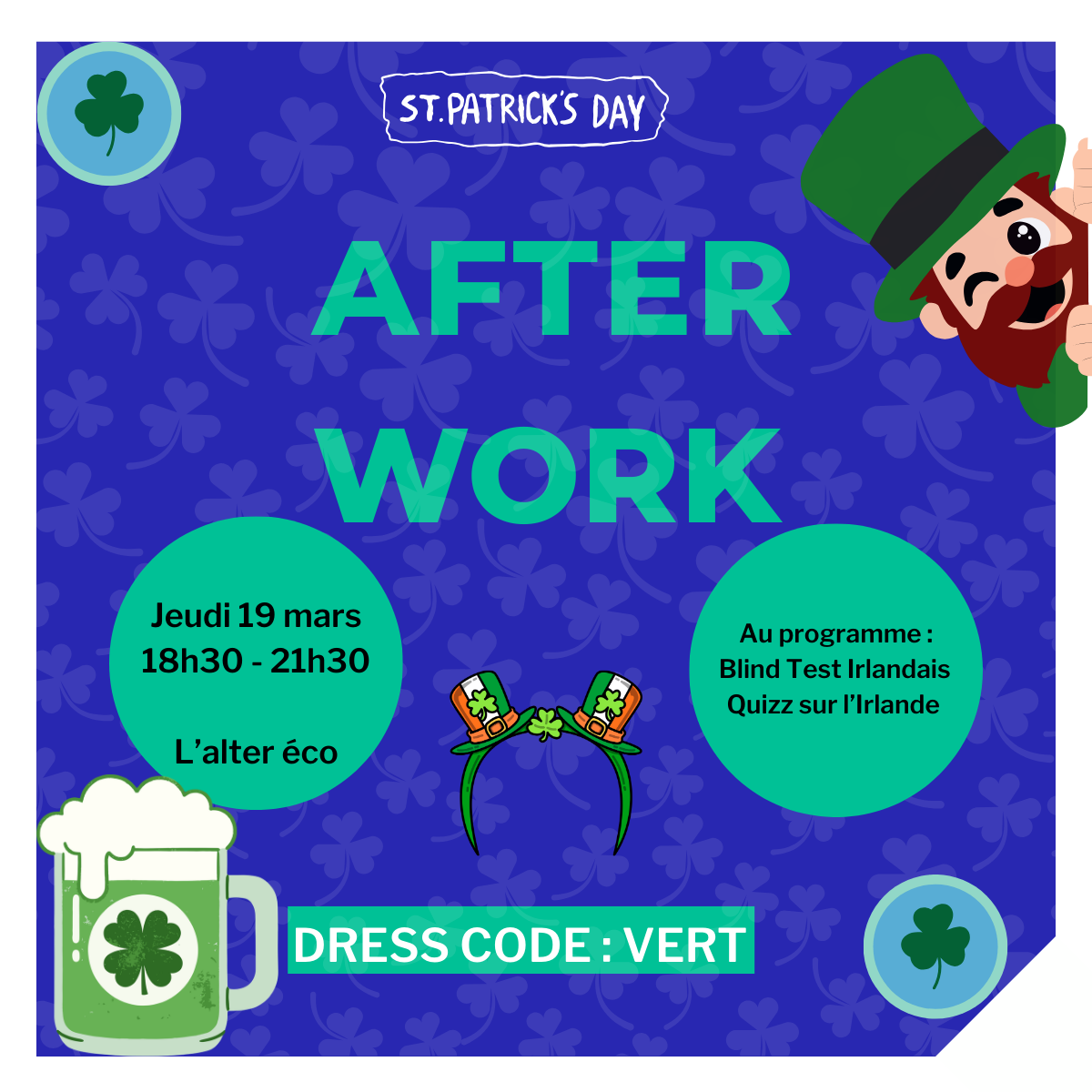 De 18h30 à 21h30, on vous prépare un afterwork convivial et festif pour célébrer la Saint-Patrick comme il se doit : de quoi grignoter, des bières avec et sans alcool, des jus, et surtout une belle dose de bonne humeur.